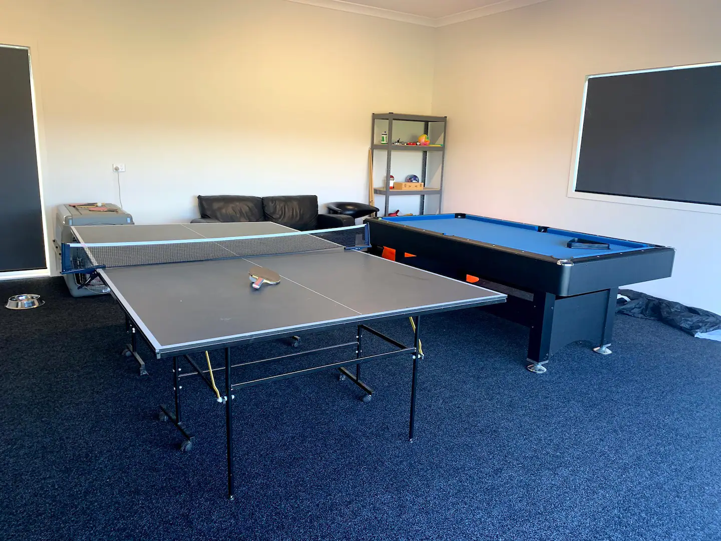 The garage has been set up as a games room with a pool, darts and table tennis.